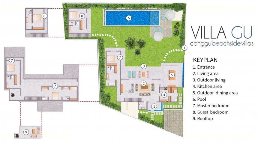 The Canggu Beachside Villas are a wonderful vacation choice for families or groups looking for a luxurious beachside haven in Bali's sought-after location Berawa located between Canggu and Seminyak. Located fifty metres from a gorgeous natural lagoon, with the renowned Café del Mar and Lalaguna just a 100 m stroll from your front door, the three villas have been designed to an extremely high standard, each with its own unique character. Five-bedroomed Villa Gu, four-bedroomed Villa Vida and three-bedroomed Villa Boa all have private entrances, walled gardens and large swimming pools, and can be combined in any number of ways to meet your specific holiday requirements – sleeping up to 24 people in total. A contingent of helpful villa staff is at your disposal to tend to your every need.