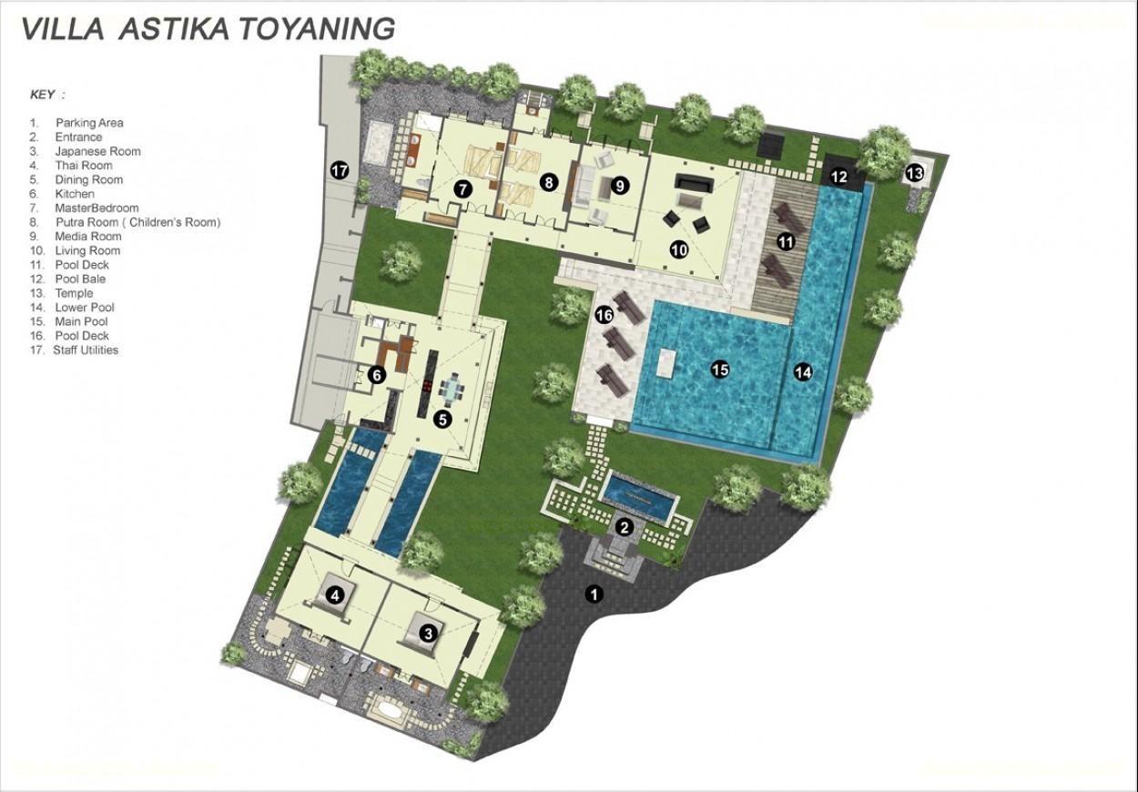 Villa Astika Toyaning provides a large private space of approx. 1,600 m2, 4 bedrooms with ensuite bathrooms (three double bedrooms, one twin bedroom), separate dining pavilion that seats 12 for dinner, an open living area and multimedia air-conditioned TV room. There are sun loungers for 8 people around the pools as well as a relaxation pool pavilion positioned at the end of the lap pool. The large open space living area overlooks both pools and garden. Villa Astika Toyaning means "beautiful water". Astika stands for beauty and minimalist and Toyaning - clean fresh water.