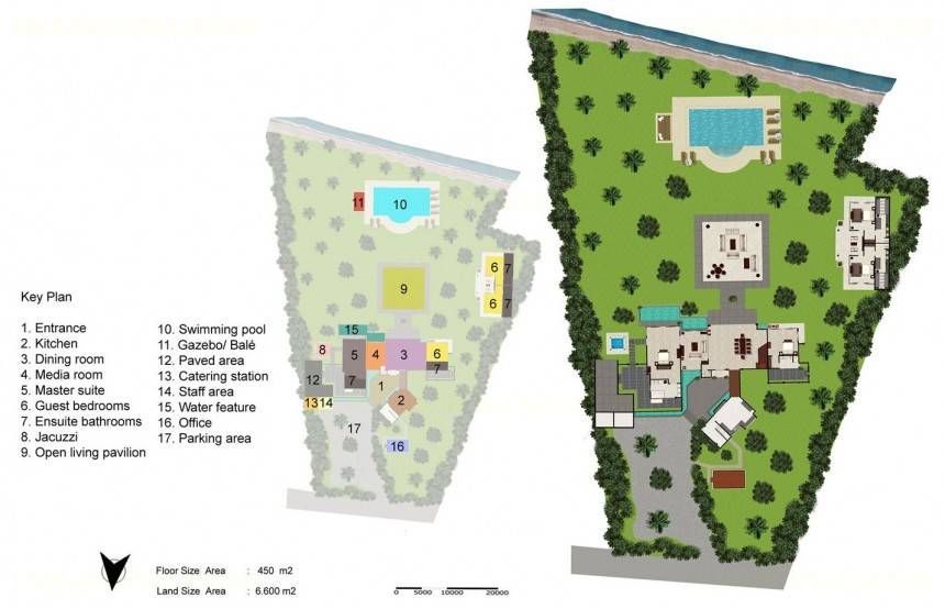 Sited on one and a half acres of land, the property includes a two storey main building with three bedrooms, dining area and entertainment room and a large separate entertainment pavilion that functions as an open-air living room fronting on the pool. In addition, there is a separate guesthouse containing two large Ocean bedrooms with en suite bathrooms.