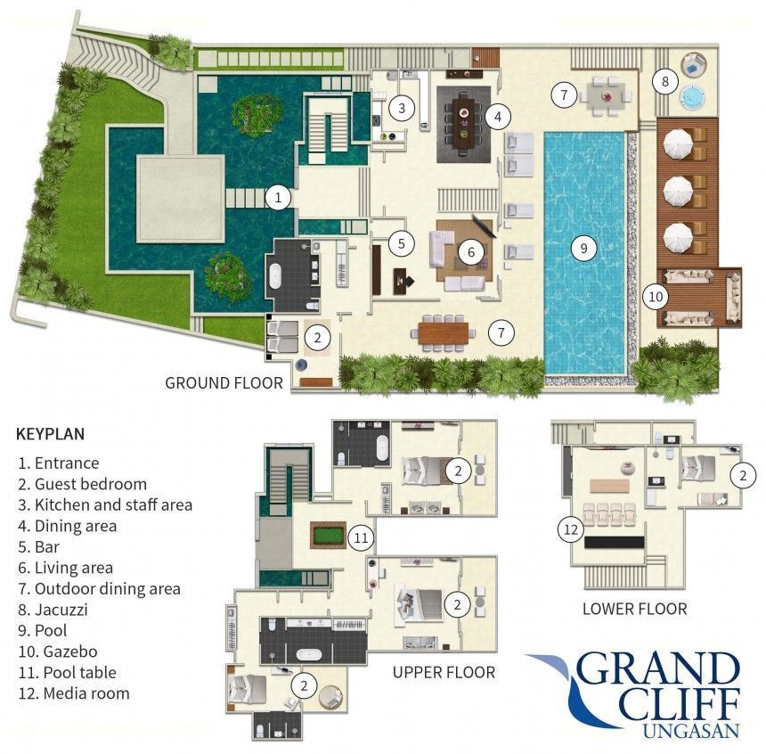 Three-storey Villa Grand Cliff Ungasan comprises five ensuite bedrooms, terraces and balconies, a cinema room, 20-metre pool, and jacuzzi deck. The villa is entered via its middle floor, which is also home to a large living/dining room with a bar, and to the pool and pool deck. The two master suites and one guest room are on the top floor. Two more bedrooms and the home cinema can be found on the lower level, which is also home to an open-air jacuzzi tub, a furnished timber deck, and a large relaxation gazebo.