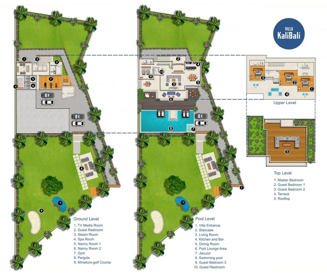 Completely renovated in 2017, fully staffed 4 bedroom Villa KaliBali offers a modern and fresh design. Bali Luxury Villas made an initial review prior to adding it to its management portfolio. Villa KaliBali impresses with panoramic ocean views of Bali’s Bukit Peninsula but even more so with its exceptional facilities and large 2100 M2 garden. What sets Villa KaliBali apart is that it has a variety of special facilities that are rare to find under one villa roof, such as a miniature golf course, gym, jacuzzi, spa and steam room, even a cool sunken lounge area within the pool! Villa KaliBali provides plenty of common areas allowing families and friend to enjoy time together but enough privacy for everyone to find their special nook. The private villa is ideal for family vacations, friend’s reunion and even medium size events such as weddings or dinner parties. Villa KaliBali is close to the best Bali surf breaks, the beautiful swimming beaches of the Nusa Dua & Bukit Peninsula and Nusa Dua Golf course!