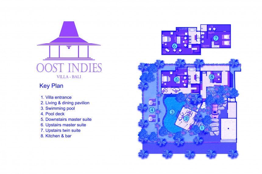Villa Oost Indies is entered via the living and dining joglo, which opens onto the pool and gardens beyond. To the right is a two-storey sleeping pavilion with a bedroom on each floor and a bar on the lower floor. The kitchen is adjacent and looks over a small courtyard. The separate guest wing bedroom is above the kitchen, accessed by stairs at the end of a garden path.