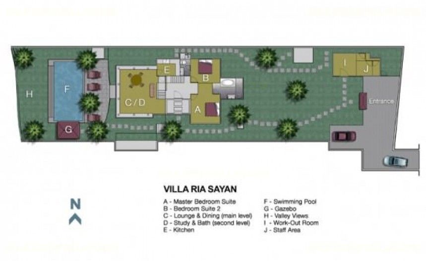 Stone stairs lead down from the villa entrance foyer to the spacious, open-air, traditional Balinese style living and dining pavilion. From here you will enjoy one of the most spectacular views in all of Bali - the beautiful Sayan Valley. The villa is furnished with Indonesian antique furniture and artifacts, traditional hand woven textiles and local Balinese crafts.