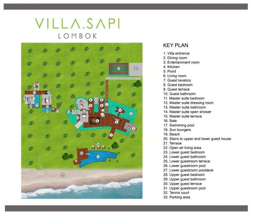 Villa Sapi in Lombok is a 5 bedroom, 3 pools masterpiece of design. Villa Sapi is bordered by Sira Beach against a backdrop of soothing seas, soaring peaks and sensational sunsets. Villa Sapi has a tennis court an additional childrem's pool and a stand-alone 2-bedroom guesthouse. Sapi with its funky architecture, set on a 2500m2 land, offers an exemplary service and gourmet cuisine. Villa Sapi’s massive beachfront garden, makes it also an ideal Lombok wedding or event venue, which can host up to 40 guests. Villa Sapi is secluded but not isolated, its neighbours include the Kosaido Golf Country Club and The Oberoi.