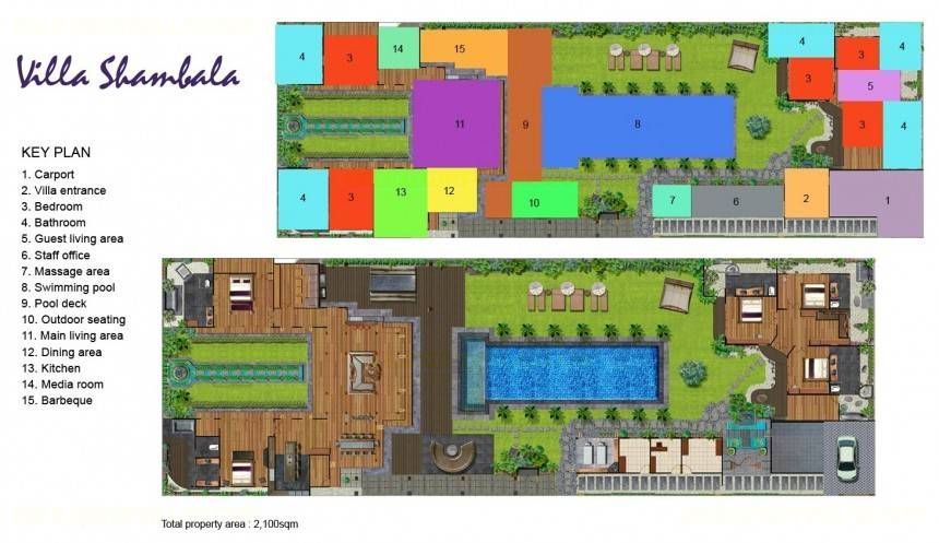 Entering past a double private parking area, guests are greeted by the sweeping tropical vegetation flanking Villa Shambala’s stunning 19m pool. The three separate pavilions of Villa Shambala face the pool, which is bordered by lush palm trees and a flat, manicured lawn. The main pavilion sits at the far end comprising living/dining areas, two main bedrooms, media room, open-plan kitchen and peaceful lily pond set between the two bedrooms. Generous outdoor living and dining areas flow off the main building featuring a twenty-seat table, outdoor lounge and BBQ, two cabanas and sun loungers. The second pavilion is situated in complete privacy at the opposite end of the pool and house three ensuited bedrooms and a second media room. Alongside the pool sits a private air-conditioned spa room with double massage tables.