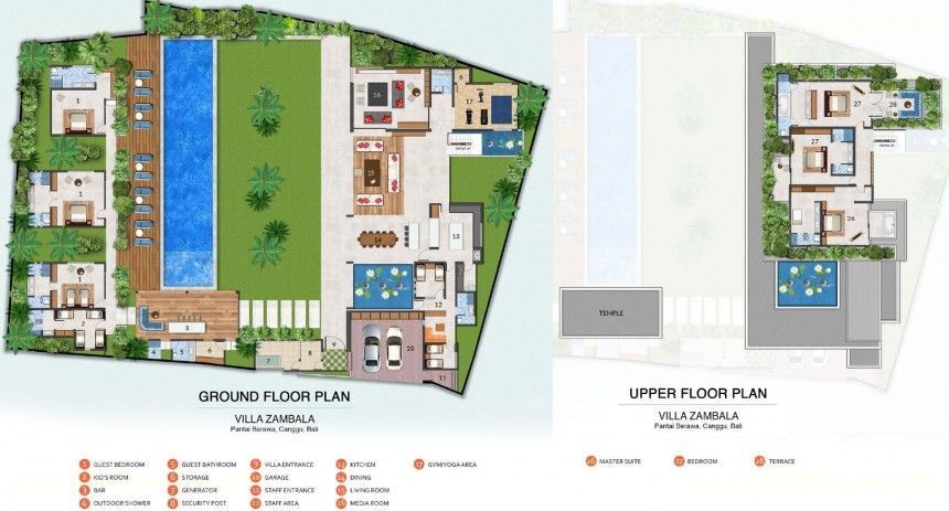 The grounds of Villa Zambala are beautifully landscaped with a colourful variety of mature tropical plants. Concealed behind a wall of verdant garden, a hidden walkway behind the Pool Deck leads to three more delightful, light-filled guest rooms - each with private garden patio and delightful indoor/outdoor bathroom. In addition the “Kids Room” with ensuite bathroom offers a bunk bedroom for up to 4 children (12 years & below).